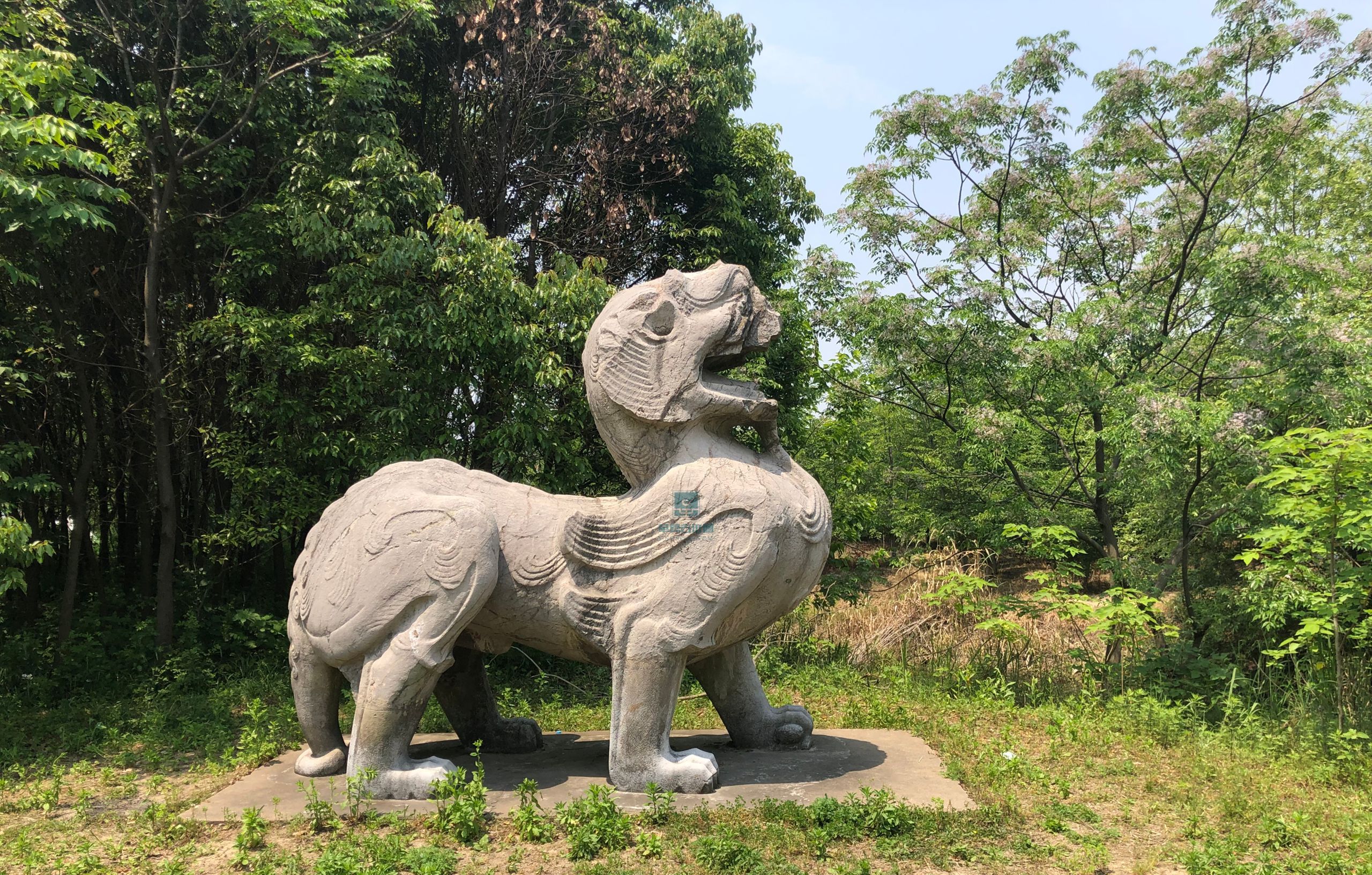 齐明帝萧鸾兴安陵石刻是南朝齐明帝萧鸾与敬皇后的合葬陵前石刻,位于江苏省镇江市丹阳荆林三城巷东北。陵东向,现存一对石兽。现存石兽中,南为麒麟,独角已残、四足全失,身长3.02米,残高2.70米,兽身雄健,翼纹精巧,脊背有连珠状雕饰。北为天禄,仅存前躯残段。其雕刻艺术风格更近梁代,学术界对其墓主存有异议。有观点认为此处石刻应为梁敬帝萧方智陵前之物。