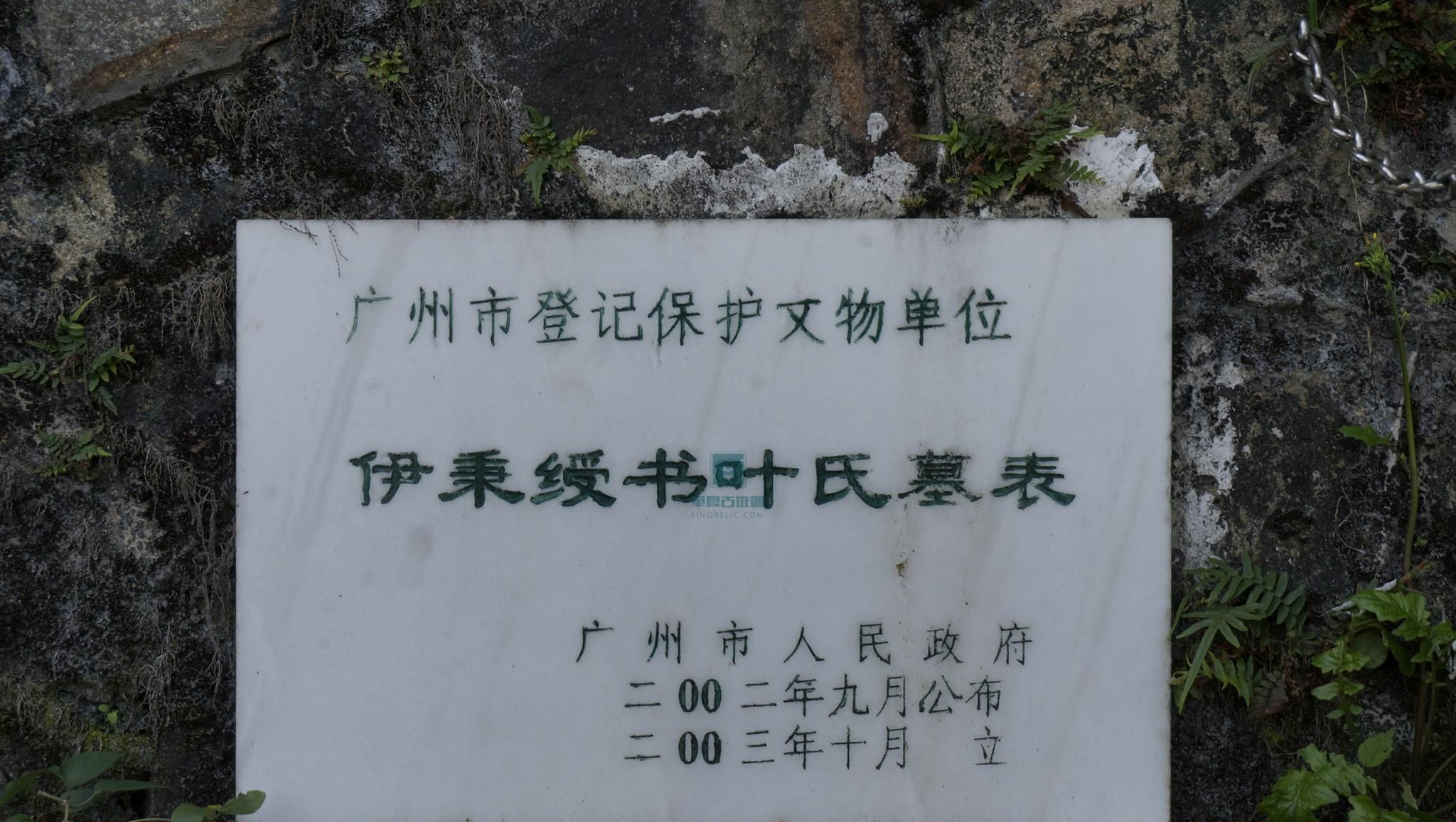 伊秉绶书叶氏墓表为清代书法家伊秉绶为南海叶山界石桩花溪所书墓表,现位于广州白云山郑仙岩畔“天南第一峰”牌坊东侧台阶旁。该石刻呈门拱形,高2.34米、宽0.92米,篆书镌刻,正文单字约0.08米,属粤中名石刻之一。文化大革命期间遭损毁,幸存拓片现藏广州市文物考古研究所,1982年依残石复原置回原处,字迹文句仍可辨识。伊秉绶(1754-1815),福建宁化人,乾隆年间进士,曾任广东惠州知府,以清廉善政著称。其书法尤精隶体,风格博大超绝,与邓石如齐名。此墓表为其在粤期间代表作品,兼具艺术与文献价值,2002年9月经广州市人民政府公布为登记保护文物单位。
