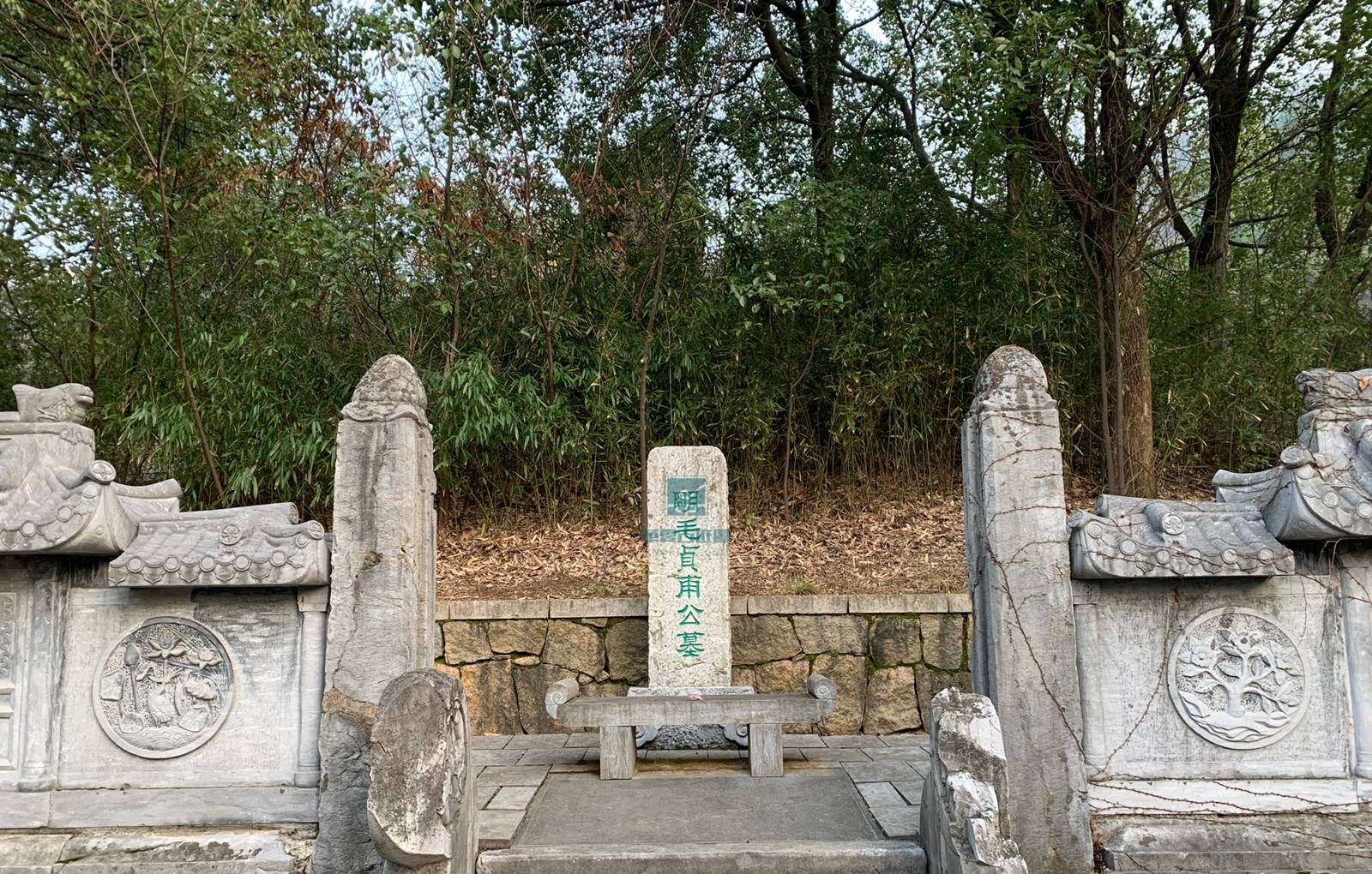 毛珵墓为市级文物保护单位,位于苏州市天池山,墓主为明代吴县人毛珵(字贞甫)。成化年间进士,历任南京工科给事中、山东参议、浙江参政、泉州知府、南京鸿胪寺卿,官至南京右副都御史(正二品),因讨伐宁王朱宸濠叛乱被追封一品。晚年返乡寓居阊门外下津桥义慈巷,后隐居天池山寂鉴寺,终年八十二岁。墓葬原有石坊、碑亭、石龟等构筑物在文革期间被毁,现占地1100平方米,坐东面西,封土存高1.5米,底径2米,周围砌有青石罗城。墓道遗存石马一对,仰首垂尾的骏健形态仍存,头部为现代修缮所补;文官俑一对执笏板戴高冠,头部同样经修复。该墓被列入苏州市区第一批吴文化地名保护名录古墓类纪念地,名录序号为136。
