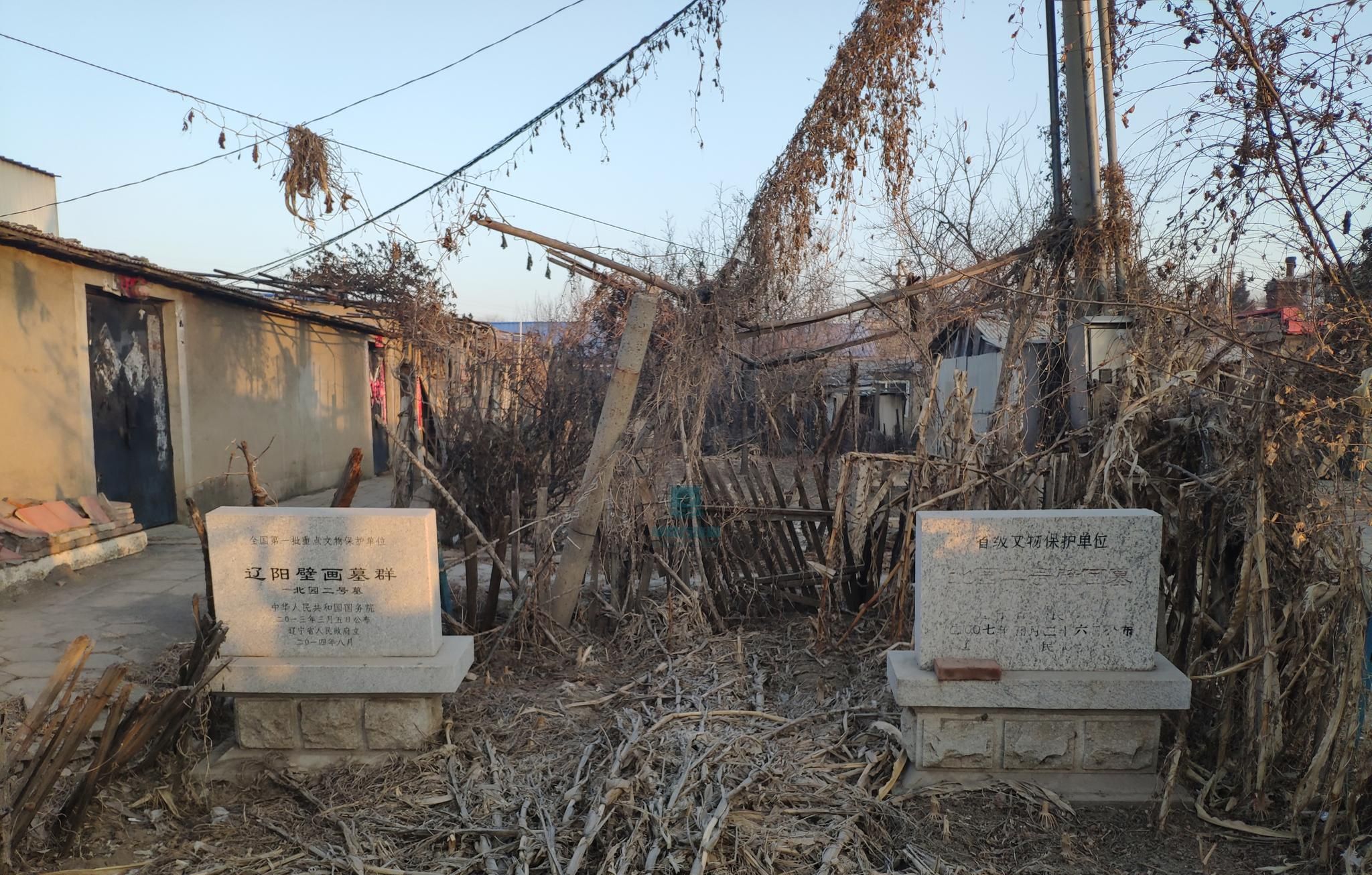 北园二号墓位于辽宁省辽阳市白塔区铁西街道铁合社区,属汉魏时期墓葬,占地面积19.8平方米。2013年3月5日被列为第七批全国重点文物保护单位(编号7-1959-2-004)。该墓平面呈“工”字形,以南芬页岩大板石构筑,白灰勾缝,墓长4.76米、宽4.32米、深1.78米,设有前后廊及左右耳室,内置三个尸床葬五具人骨。墓室壁画以朱、黄、赭等色绘制门卒、门犬、武器架、鹤、日月等图像,并呈现佛教莲花、忍冬、飞天纹样。该墓发现于1959年11月,现存壁画因积土侵蚀部分模糊,随葬品仅存陶榻、金耳环等。