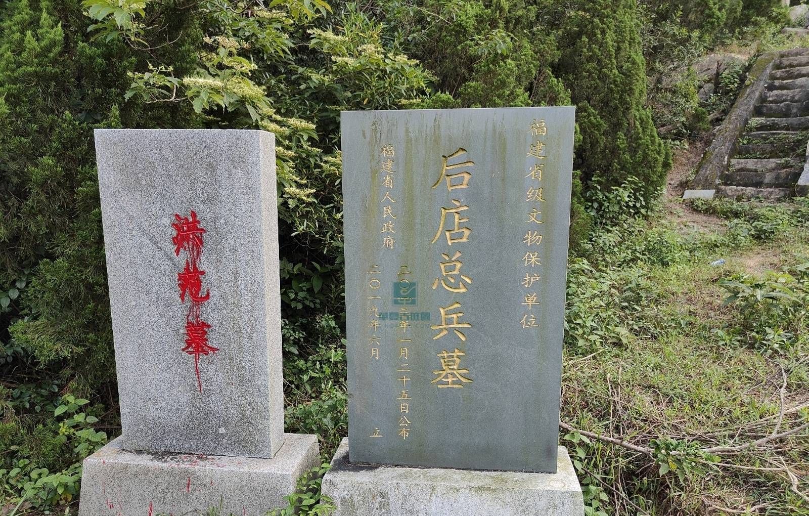 后店总兵墓,又名洪范墓,位于福建省惠安县黄塘镇后店村,建于清代。2013年1月28日被福建省人民政府列入第八批省级文物保护单位名单。墓主洪范,字寿箕,号仁庵,累官至福建海坛镇总兵,署理陕西固原并福建水师提督印,官正一品,在康熙年间平定靖南王耿精忠叛乱、郑经盘踞的福建沿海地区和台湾、噶尔丹都叛乱中屡立战功。墓坐西南向东北,依山势而筑,平面略呈“风”字形,占地面积1012平方米。墓室双圹,呈屋式,三合土构筑;墓前辟有三级埕台,两侧分列石翁仲、石马、石虎、石羊、八角形石望柱各一对,以及龟趺座和谕祭碑。